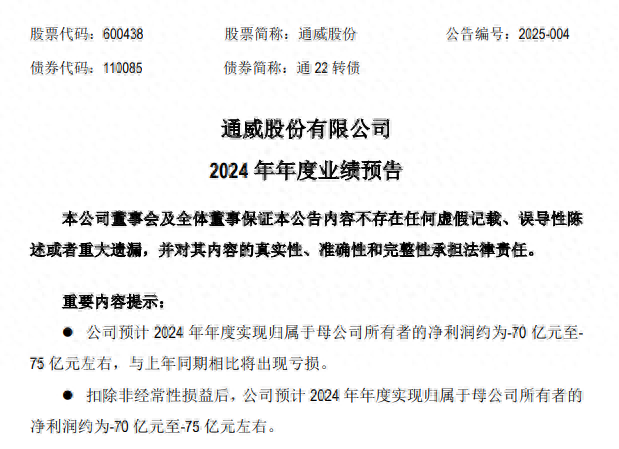 2024年,通威股份预计归母净利润亏损70亿元至75亿元左右,同比转亏;扣非净利润亏损70亿元至75亿元左右。